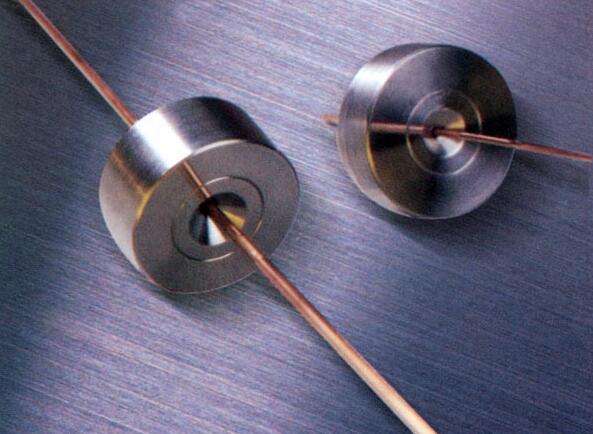 由于鋼絲拉拔工作條件的制約,拉絲模芯的材質不僅 具有很高的硬度和耐磨性,而且要有足夠的強度(抗壓強度和壓彎曲強度)、韌性和很光潔的工作表面,同時要考慮到適應各種潤滑劑、各種涂層的腐蝕,及包括大氣在內的氧化,要求與鋼絲表面的粘附性小、膨脹系數小而導熱率高,以及價格低廉加工方便等因素。當前鋼絲生產主要使用的是硬質合金制造的拉絲模。